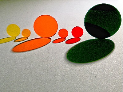 Langpassfilter in der Optik sperren die ungewünschten Bereiche kurzwelliger Strahlung. Je nach Kantenlage im VIS-Bereich erscheinen diese Filtergläser, wenn nur die unsichtbare UV-Strahlung geblockt werden soll, farblos. Je weiter die Sperr-Durchlasskante der Langpassfilter in den längerwelligen Bereich rückt, wandert der sichtbare Farbeindruck über blass-grüngelb, schliesslich über sattgelb, orange, rot, dunkelrot in den IR-Bereich, wie auf dem Bild deutlich zu erkennen ist. Der Langpassfilter ganz rechts im Bild sperrt den VIS-Bereich vollkommen, während er die IR-Strahlung ungehindert durchlässt. Deshalb erscheint er für das Auge schwarz.